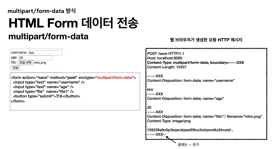 그래서 이러한 경우 HTTP에서 제공하는 multipart/form-data전송방식을 써야한다.